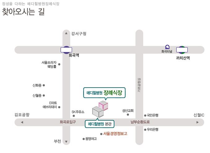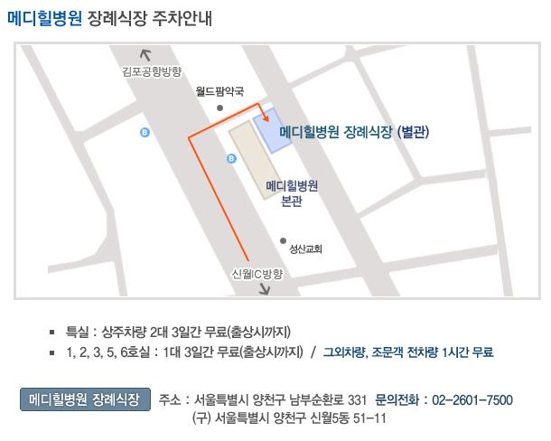 주소: 서울 양천구 남부순환로 331 (구주소: 양천구 신월동 51-11) 메디힐병원 장례식장