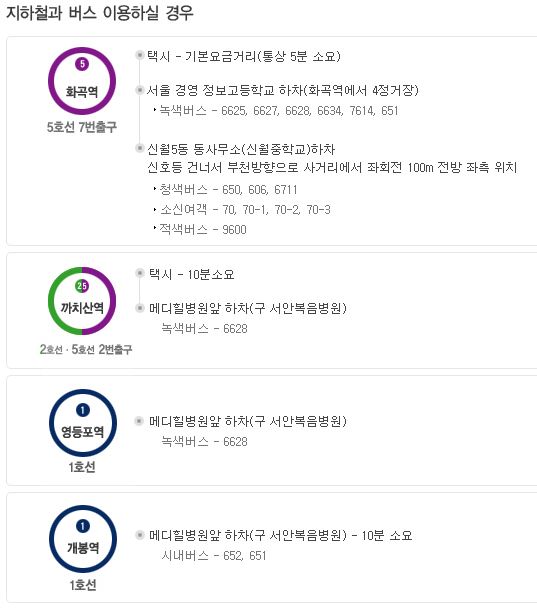 버스: 메디힐병원, 서울금융고등학교 앞 정류장이 가까우며, 우리은행 앞과 신월5동 주민센터에서도 가까운 편입니다.