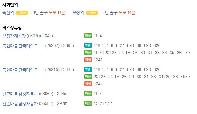 버스: 보정장례식장 마을버스 15-4, 죽현마을.단국대학교 입구 일반 116-1, 116-3, 27, 670 등 신촌마을,삼성자동차 마을버스 15-4, 15-2, 17-1