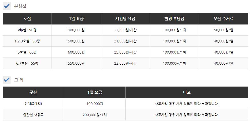 1호실(지하1층, 50평) - 1일 요금 500,000원(환경 부담금, 오물 수거료 별도)