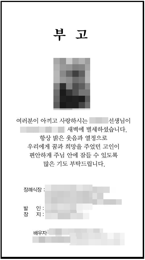 부고(訃告) - 부고란 사람의 죽음을 알리는 것을 말합니다. 부고는 한자로 (訃告: 부고 부, 알릴 고)입니다. 과거에는 편지나 전보를 이용하여 부고를 전하였지만, 최근엔 대부분이 문자와 카카오톡 프로그램을 이용하여 부고를 전달하며, 직장의 경우 회사 인트라넷이나 홈페이지에 공고하기도 합니다. 부고 문구는 부고를 알리기 위해 작성하는 양식이며 고인의 호칭, 사망일자, 발인일자, 장례식장이름(혹은 영결식장), 장지 등을 예의와 격식을 차려 간결하게 작성해야 합니다.