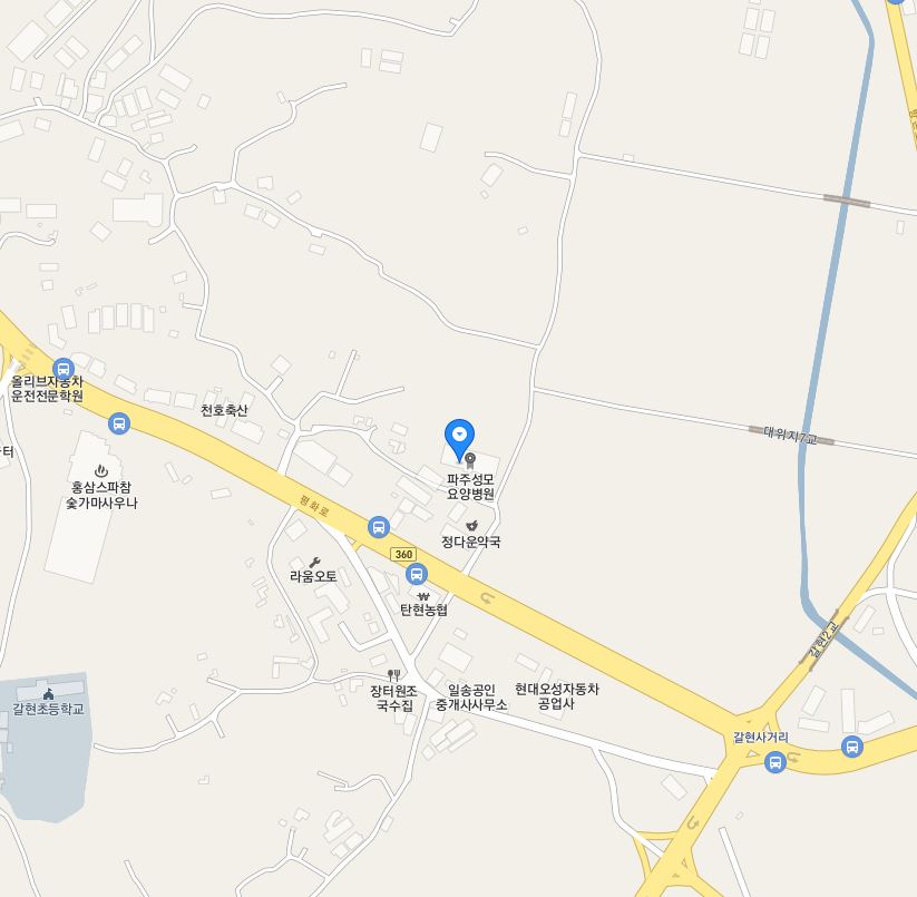 주소: (10860) 경기도 파주시 탄현면 평화로 574번길 17 (갈현리, 파주성모병원)
